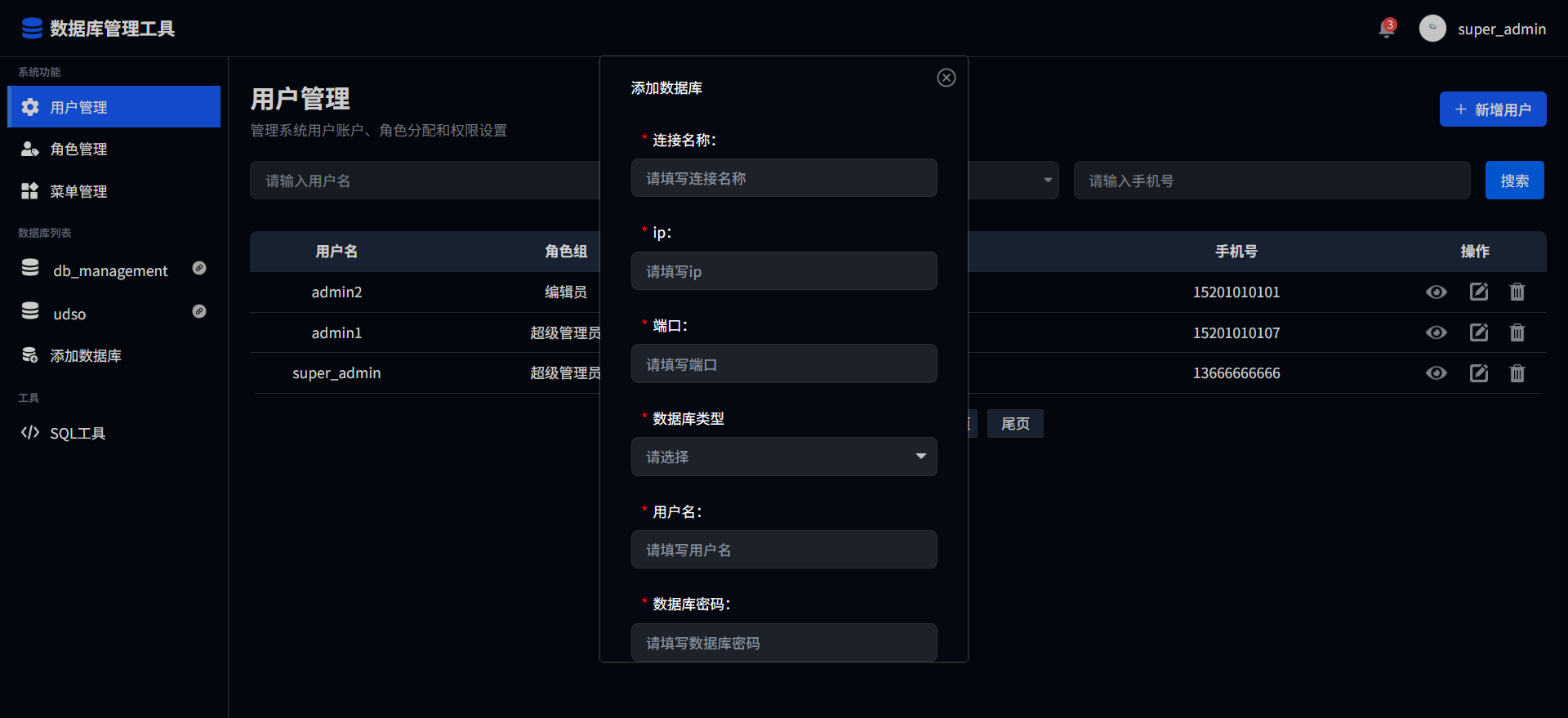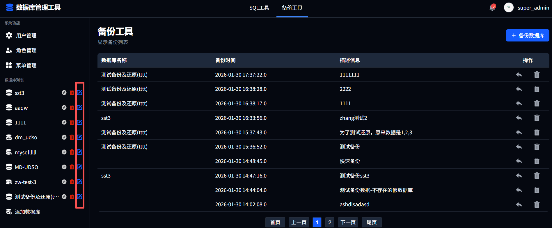 点击数据库列表中任意数据库链接名称后的编辑按钮,即可查看该链接的详细信息。重新填写信息后可进行保存操作。