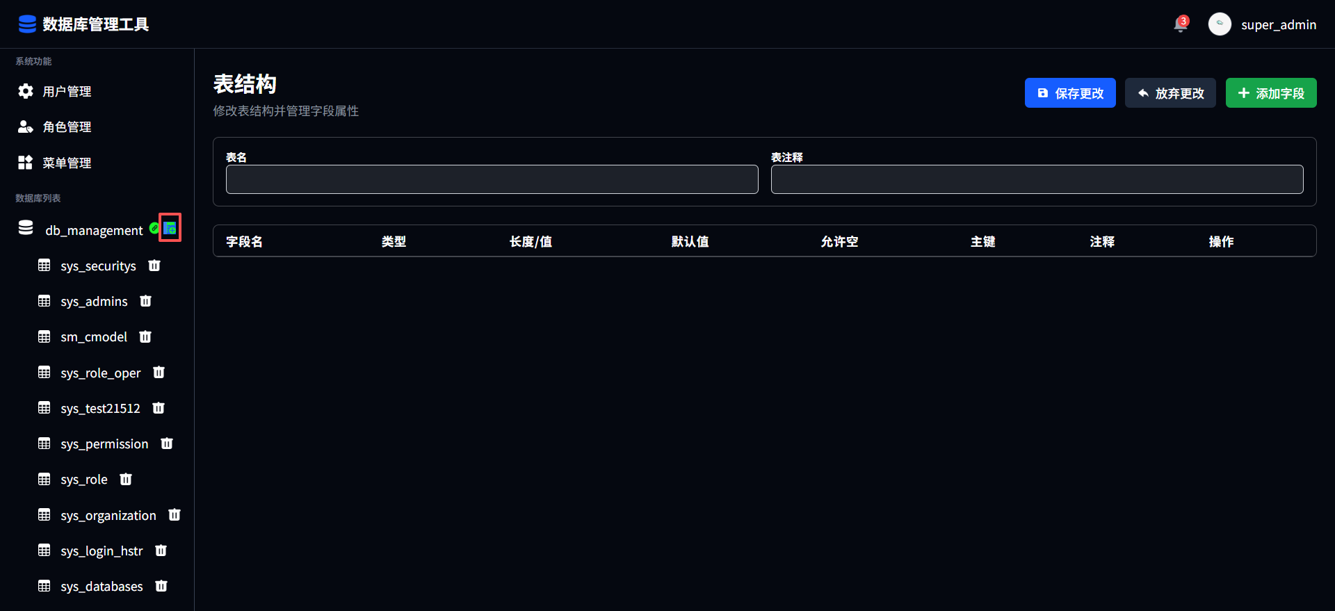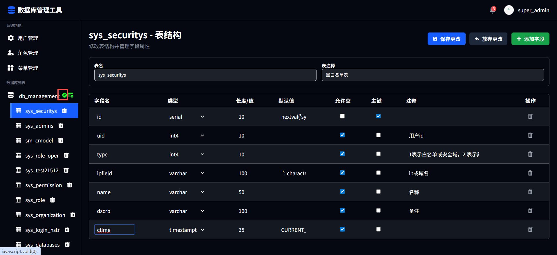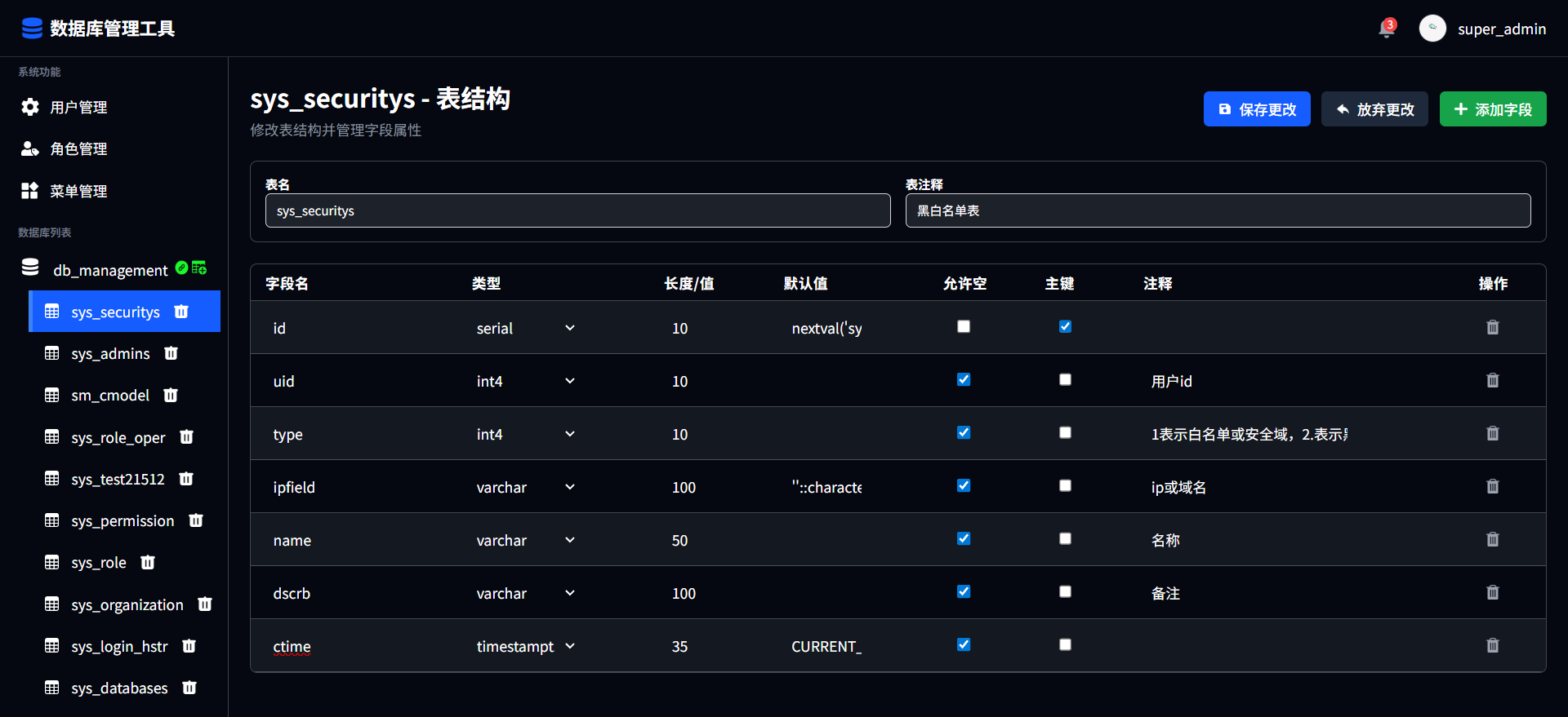 点击表名可查看对应表的表结构,用户可根据需求自行编辑表结构进行更改,点击保存更改后进行提交;点击放弃更改恢复默认信息;点击添加字段进行字段添加,填写字段名、类型、长度、默认值、允许空、主键、注释进行填写;点击对应字段后的删除图标进行删除字段。