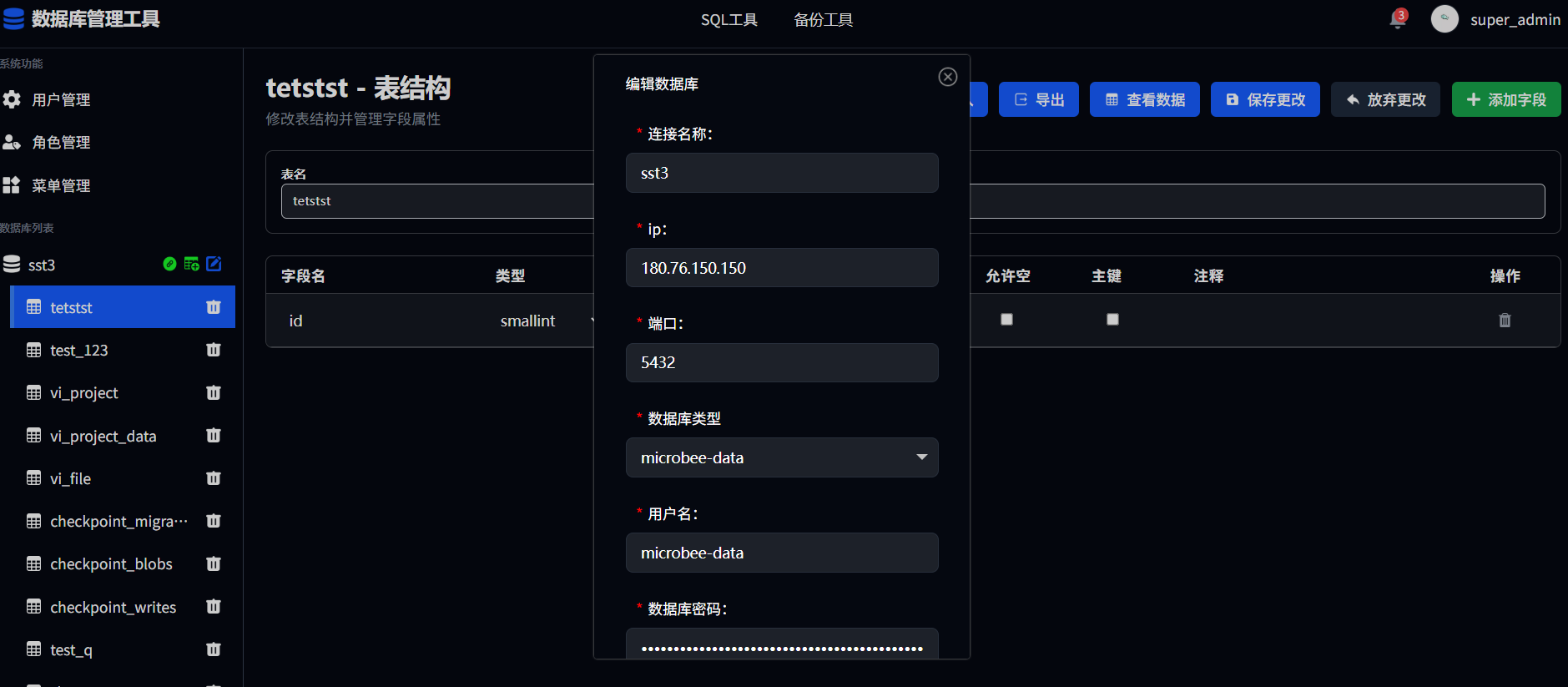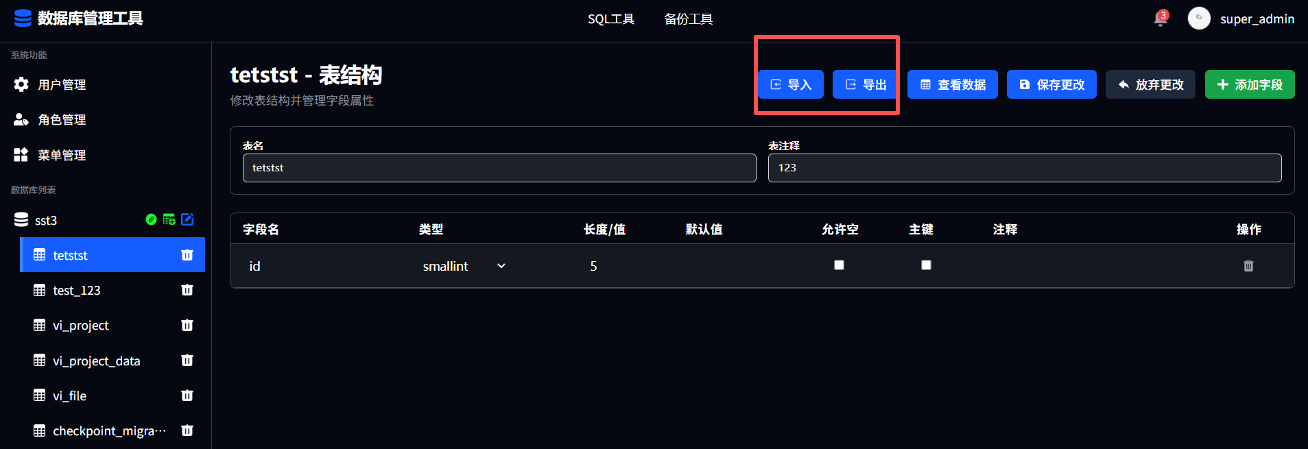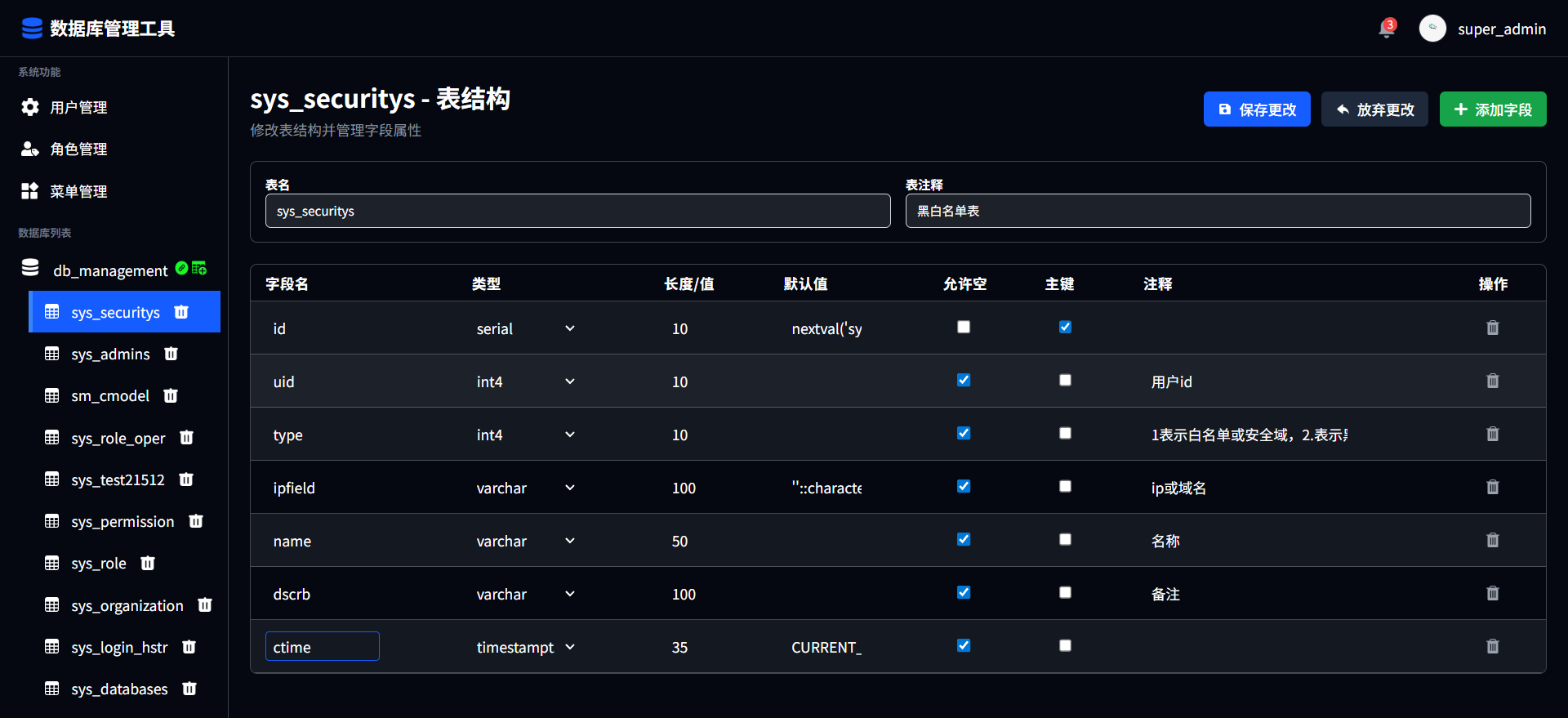点击表名可查看对应表的表结构,用户可根据需求自行编辑表结构进行更改,点击保存更改后进行提交;点击放弃更改恢复默认信息;点击添加字段进行字段添加,填写字段名、类型、长度、默认值、允许空、主键、注释进行填写;点击对应字段后的删除图标进行删除字段。