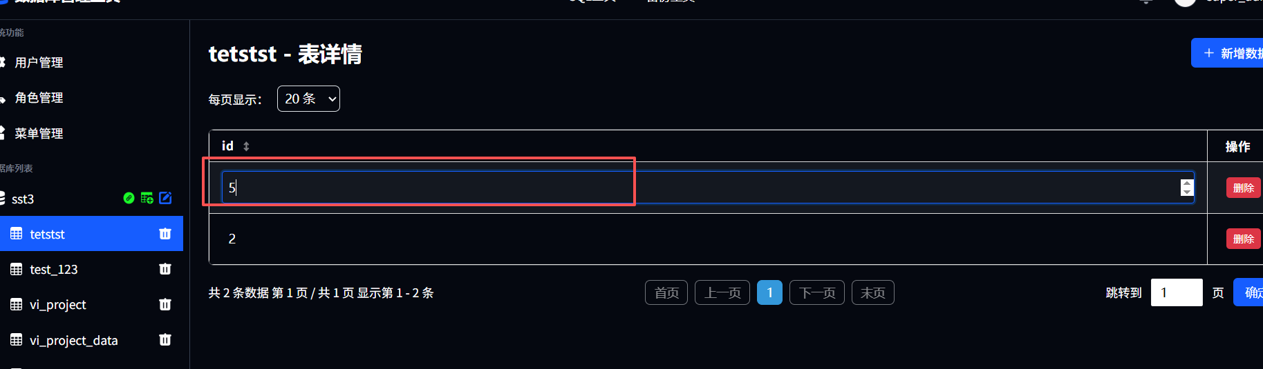 修改数据,可点击需要修改的文本框,以截图表为例,修改id,点击id列任意一条数据的文本框,进行修改原有内容,鼠标失焦后或者点击其他位置进行提交保存。