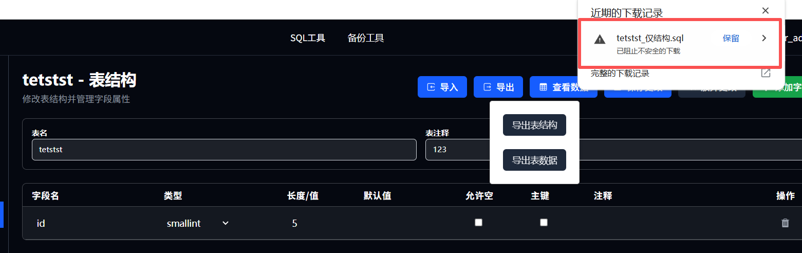 点击导出按钮,可选择导出表结构或表数据,当选择表结构时仅导出当前标的创建ddl语句,若选择表数据即可导出表结构及当前表内的数据,导出成功后进行下载操作。
