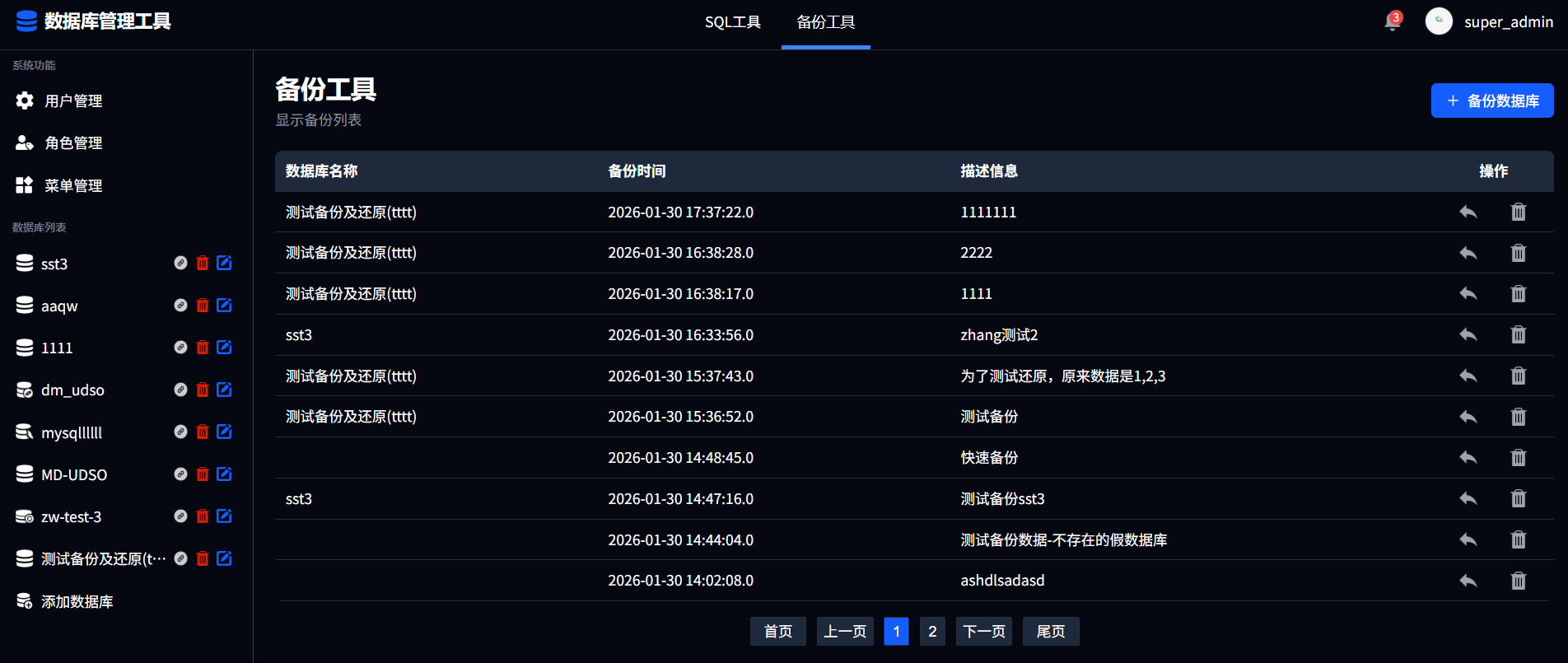 数据库备份工具中支持查看所有备份记录及进行数据库备份、还原操作。