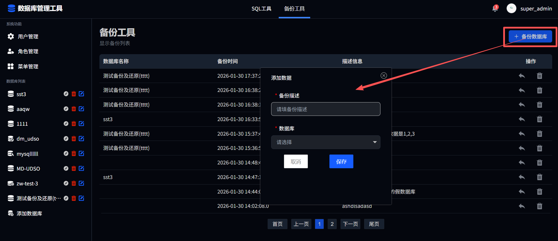 点击备份数据库按钮选择数据库,填写信息即可进行数据库备份操作。